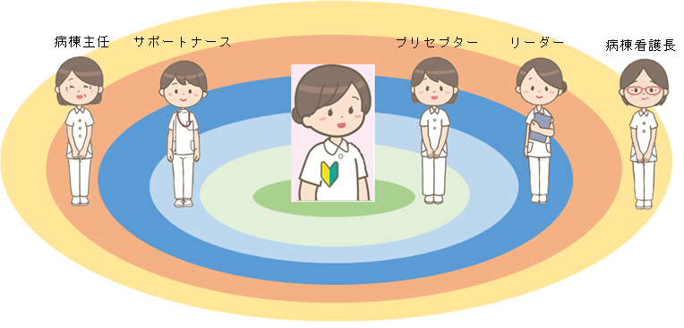 新人看護師(プリセプティ)に先輩看護師(プリセプター)がマンツーマンの指導を行います。